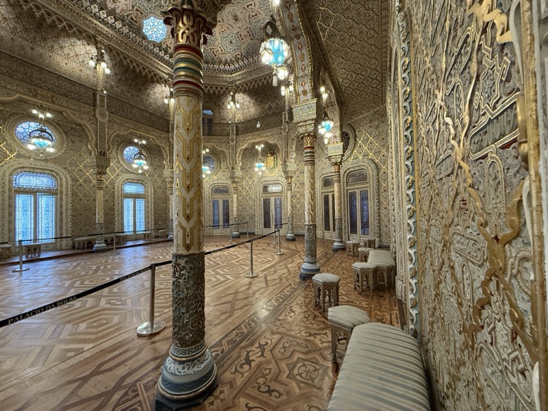 The most impressive room is the Arabian Room. Every surface gleams with beautiful gold leaf. Apparently, 18 kilograms of gold leaf were used in that room alone. The room was originally supposed to be built for Queen Mary, but unfortunately she passed away before seeing it completed. Now it hosts dignitaries, presidents, kings, queens, and prime ministers from around the world. Historically, it also served to emphasize Portugal’s business success and encourage international trade.